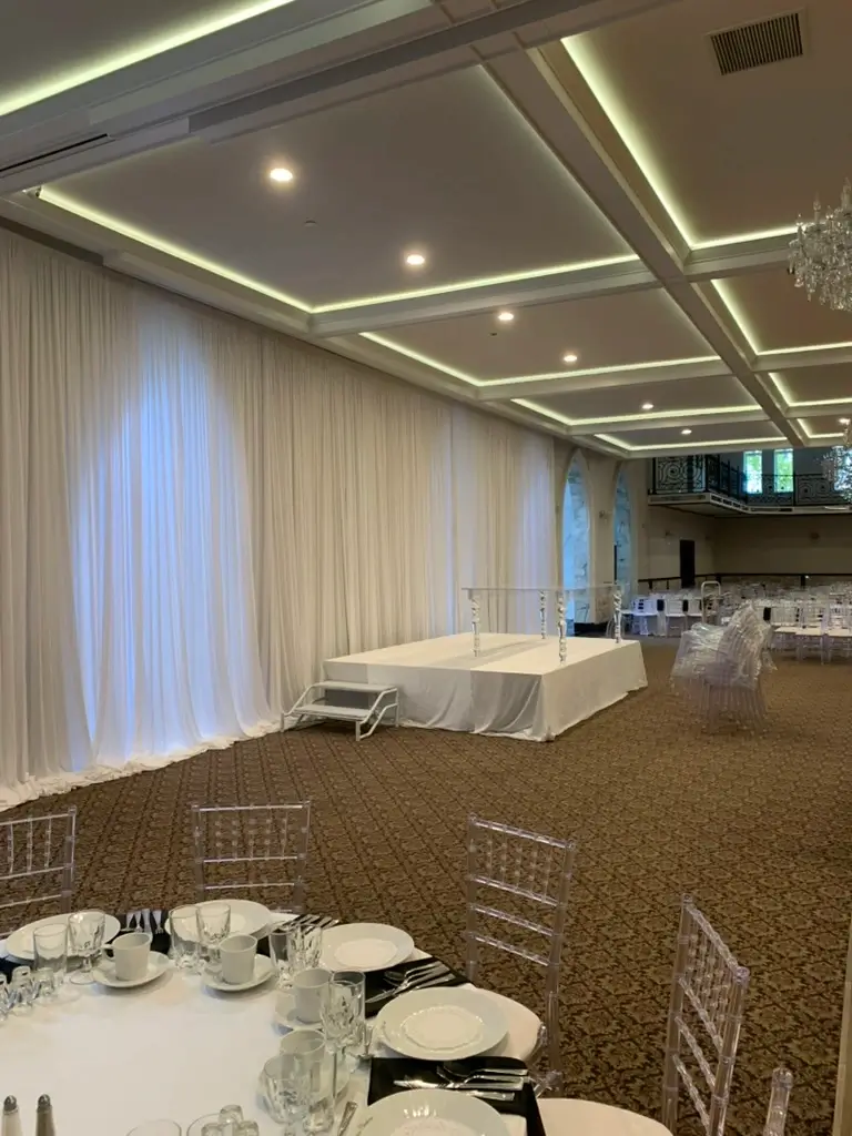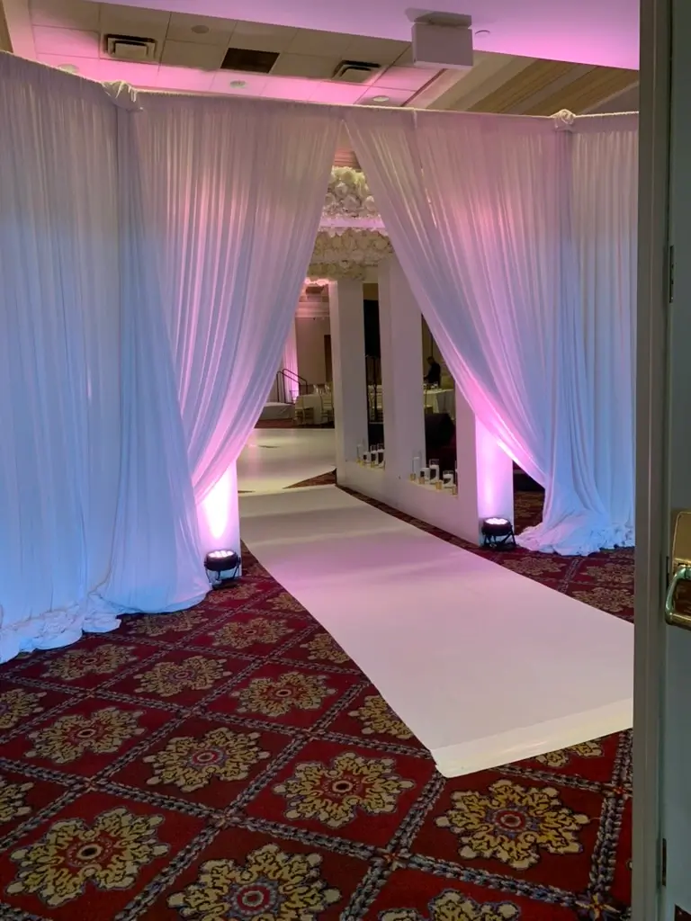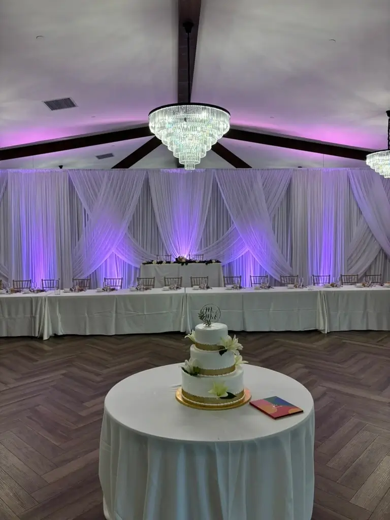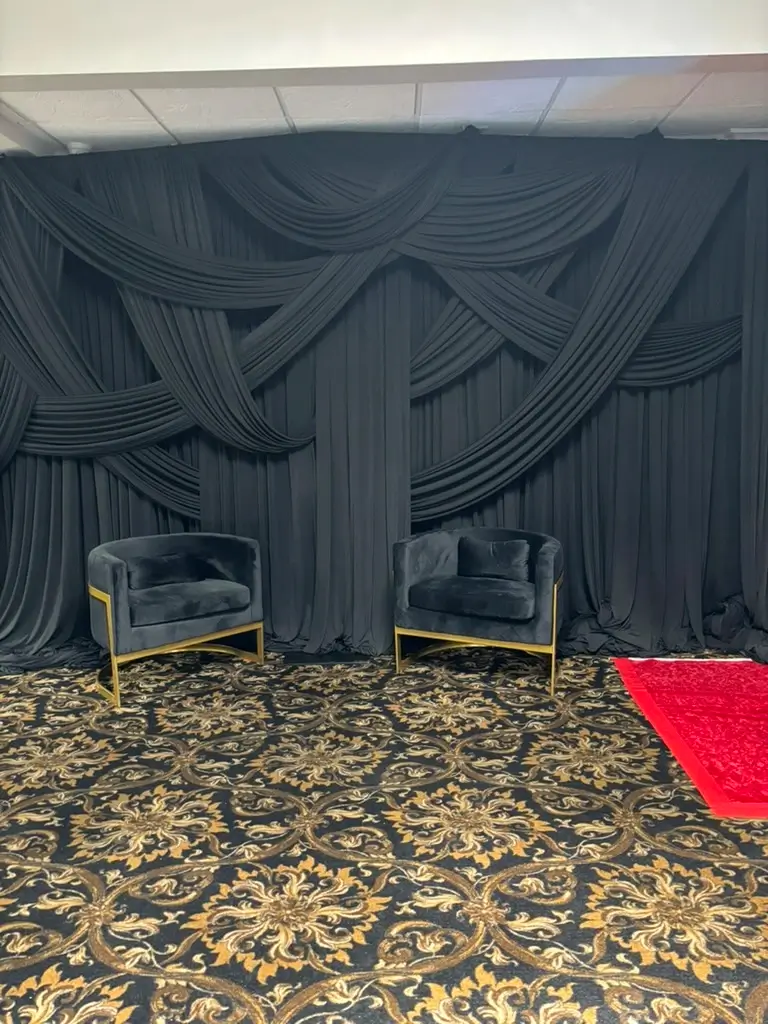 We provide professional fabric draping rentals and full installation services in Chicagoland and Northwest Indiana for weddings, quinceaƱeras, galas, corporate events, and private celebrations. Our fabric draping collection includes straight draping, double layer draping, designed layered draping, circular entrance draping, and opening draping to transform any venue space into an elegant and polished setting. Available in a wide range of colors including White, Ivory, Black, Champagne, Burgundy, Navy Blue, Victorian Lilac, Red, Fuchsia, Blush Pink, Green, Orange, Silver Sequin, Gold Sequin, and Navy Blue Sequin, our draping is fully installed and broken down by our team so you can focus entirely on your event.